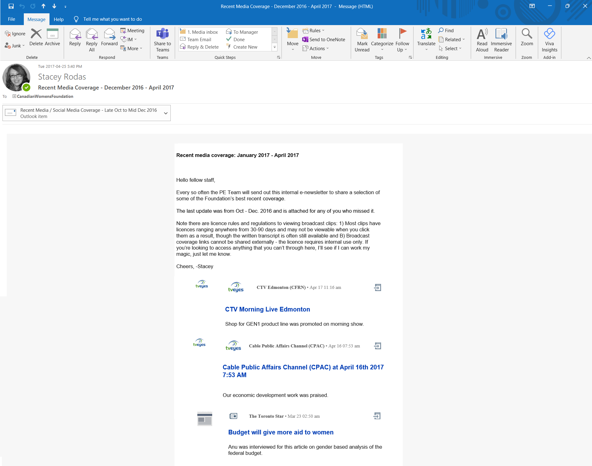 Keeping employees updated on the latest earned media coverage about the Foundation. Provides useful discussion points for Philanthropy team and Board members to use when engaging current and potential donors, i.e. "did you see the Toronto Star article about our latest campaign last week?"
